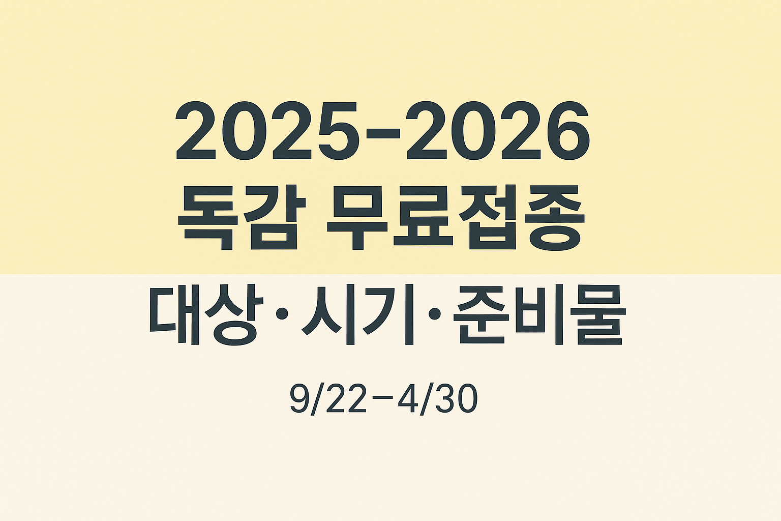 결론: 2025-2026 독감 예방접종 국가 무료접종은 2025-09-22부터 2026-04-30까지 진행되며, 대상(어린이·임신부·65세 이상)별로 시작일이 다르니 본인 일정만 확인하면 바로 접종까지 갈 수 있습니다.매년 “독감 접종 시기 언제지?”, “독감 무료접종 대상이 나도 해당되나?”, “준비물은 뭐 챙기지?” 때문에 병원 앞에서 다시 검색하는 분들이 많습니다. 이 글은 2025-2026 독감 예방접종을 검색한 다음 바로 실행할 수 있게 대상·시기·준비물만 남기고 정리했습니다.[3분 실행 가이드] 아래 순서대로만 하세요.1) 대상 확인: 어린이(생후 6개월~13세) / 임신부 / 65세 이상2) 시작일 확인: 어린이(2회 9/22, 1회 9/29) · 임신부(9/29) · 어르신(10/15~ 연..